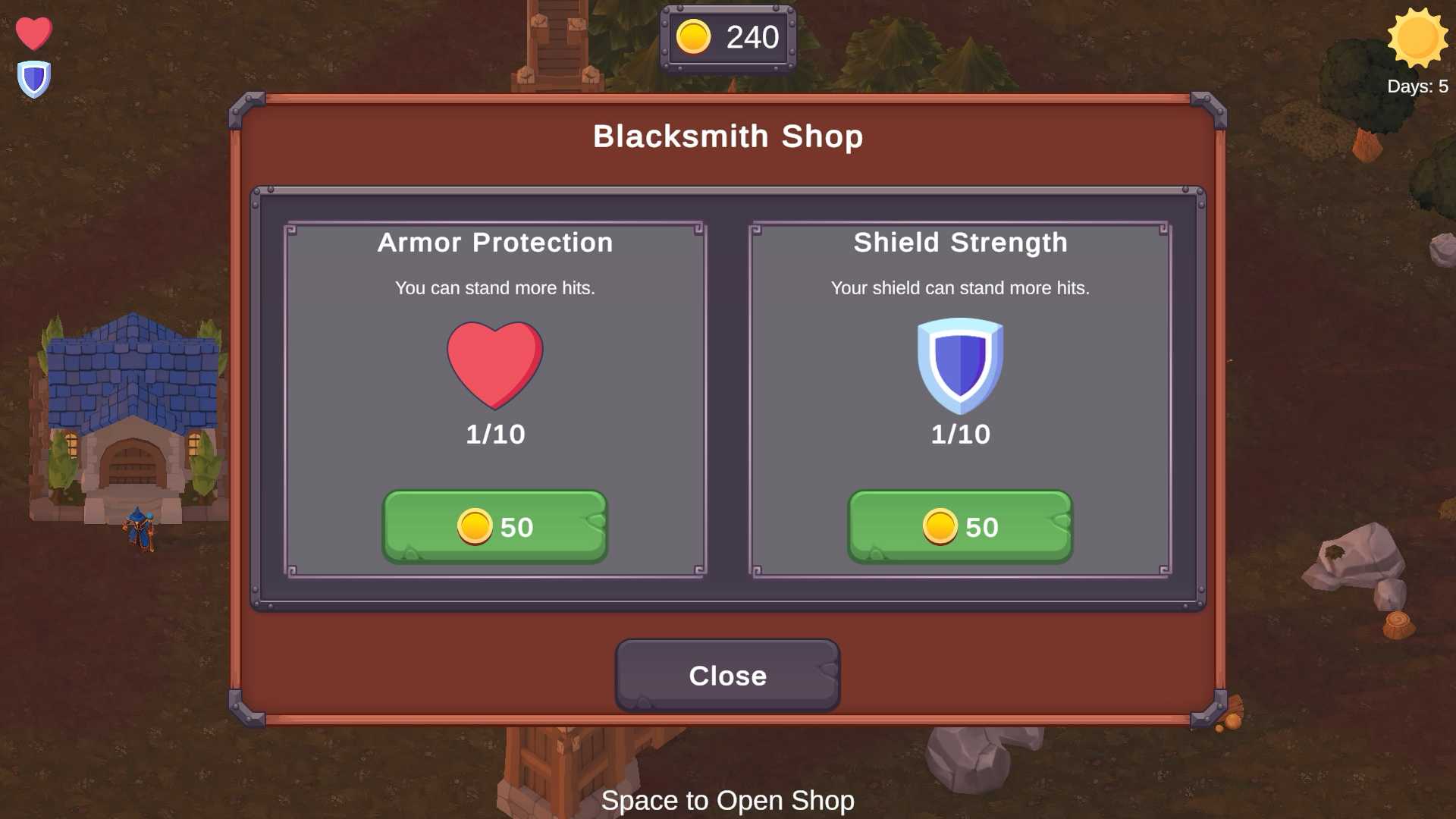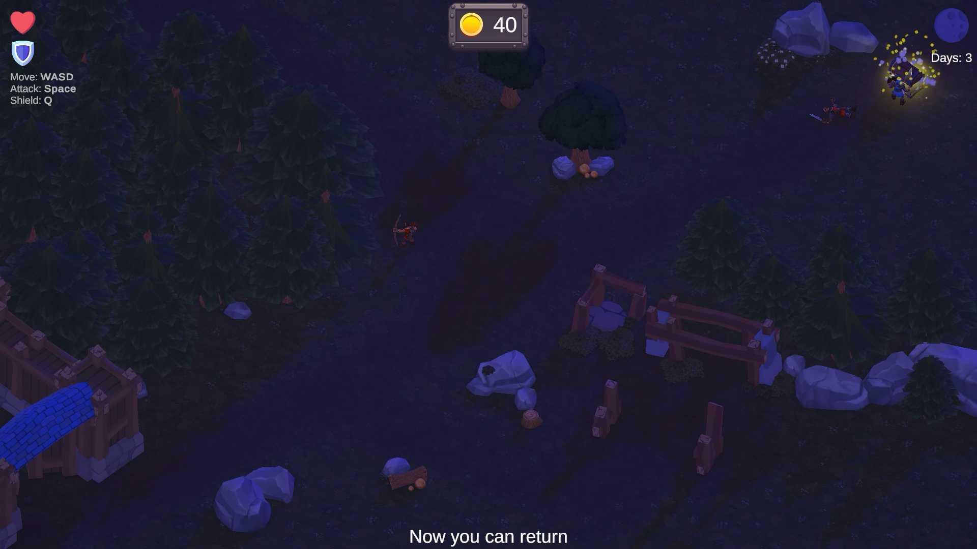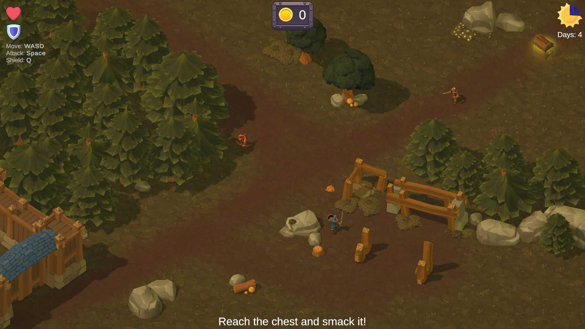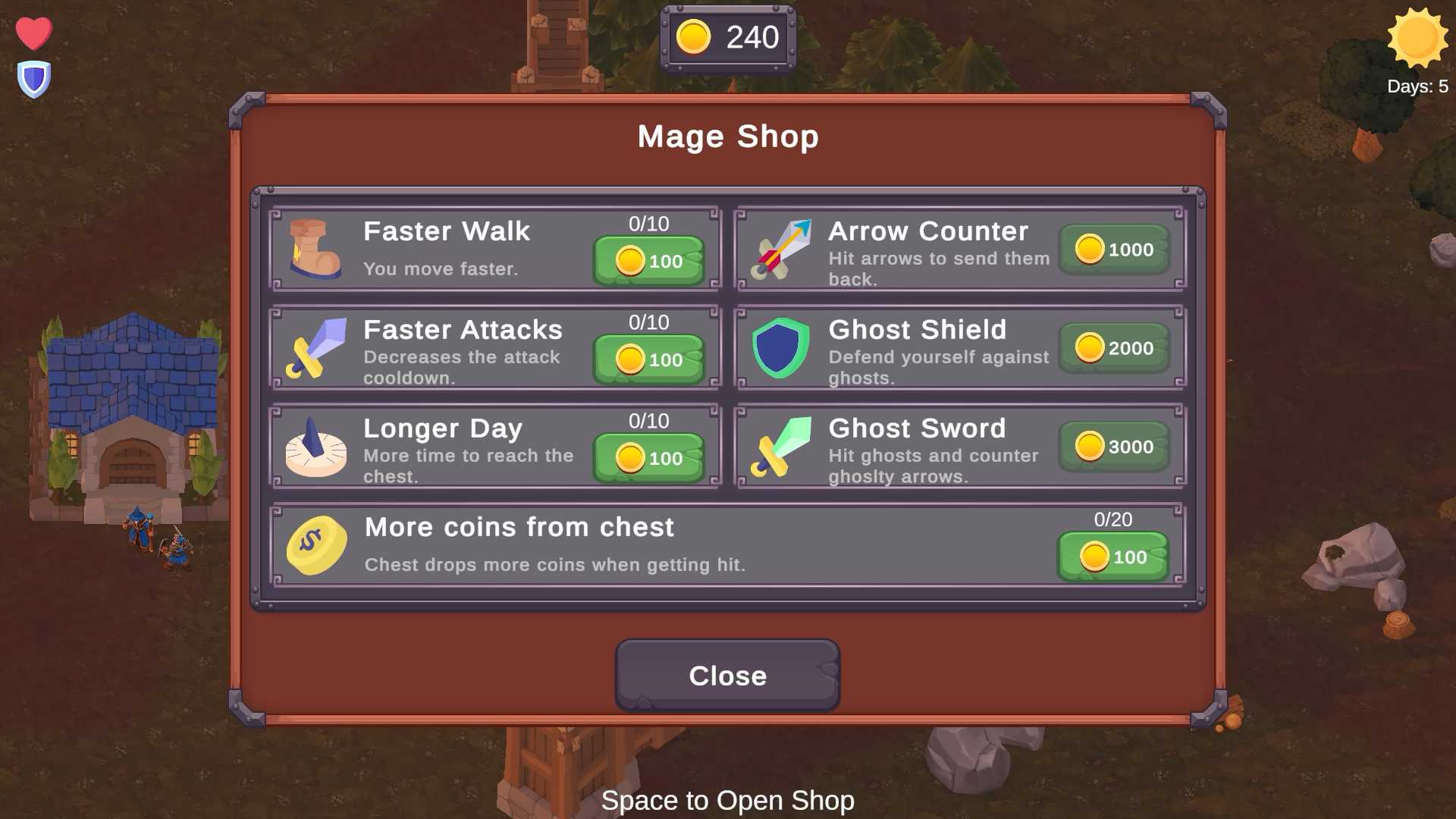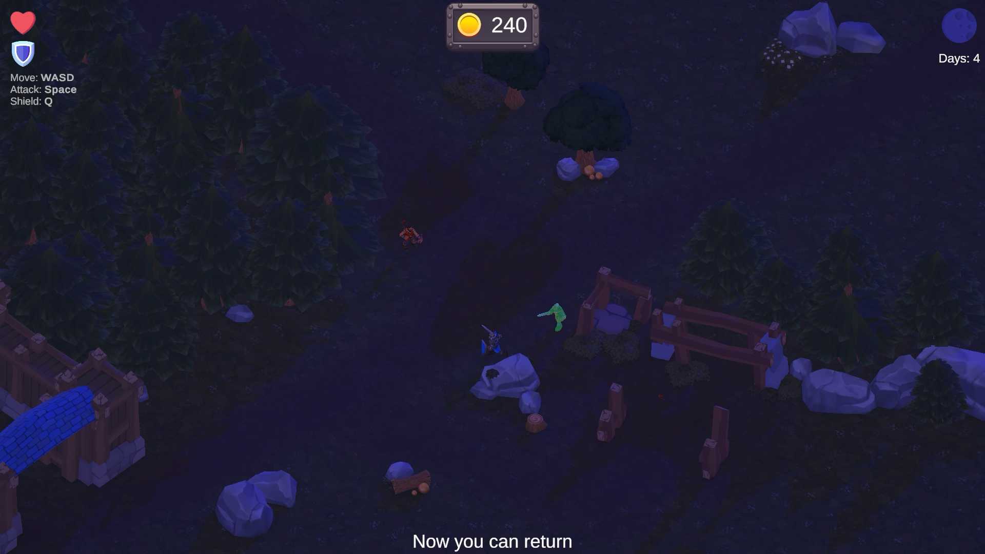 A top-down action game centered around risk, timing, and replayability. You control a lone knight exploring the map during the day, collecting gold from a central chest while fighting enemies along the way. When night falls, defeated enemies return as hostile ghosts, shifting the focus from combat to survival and escape.